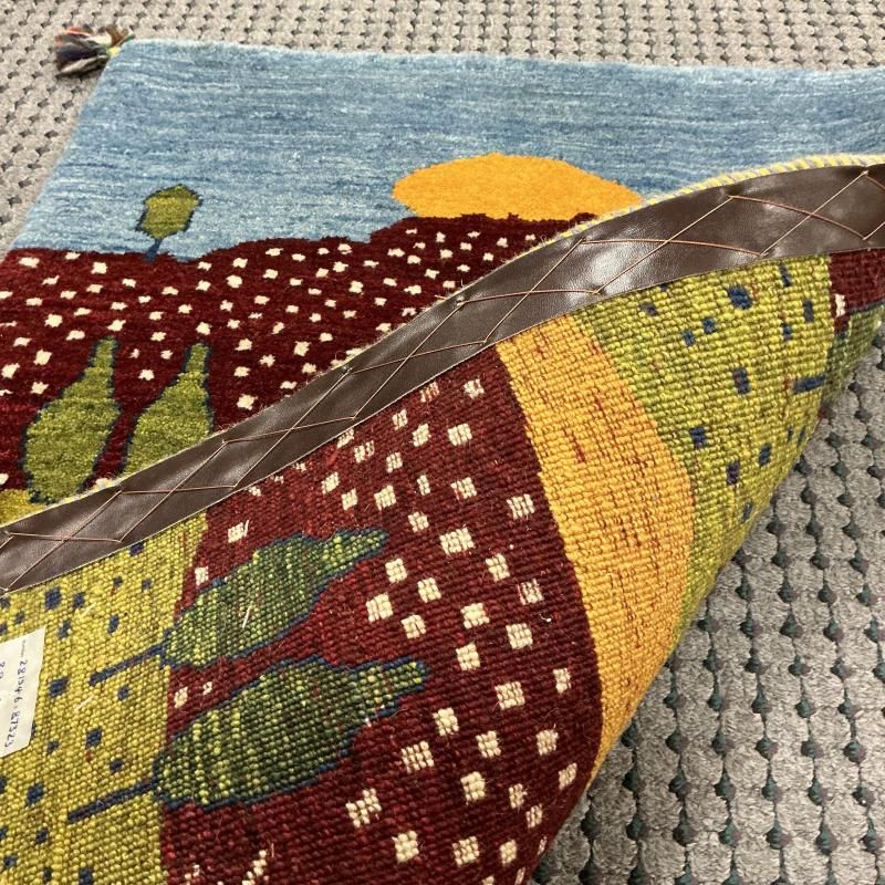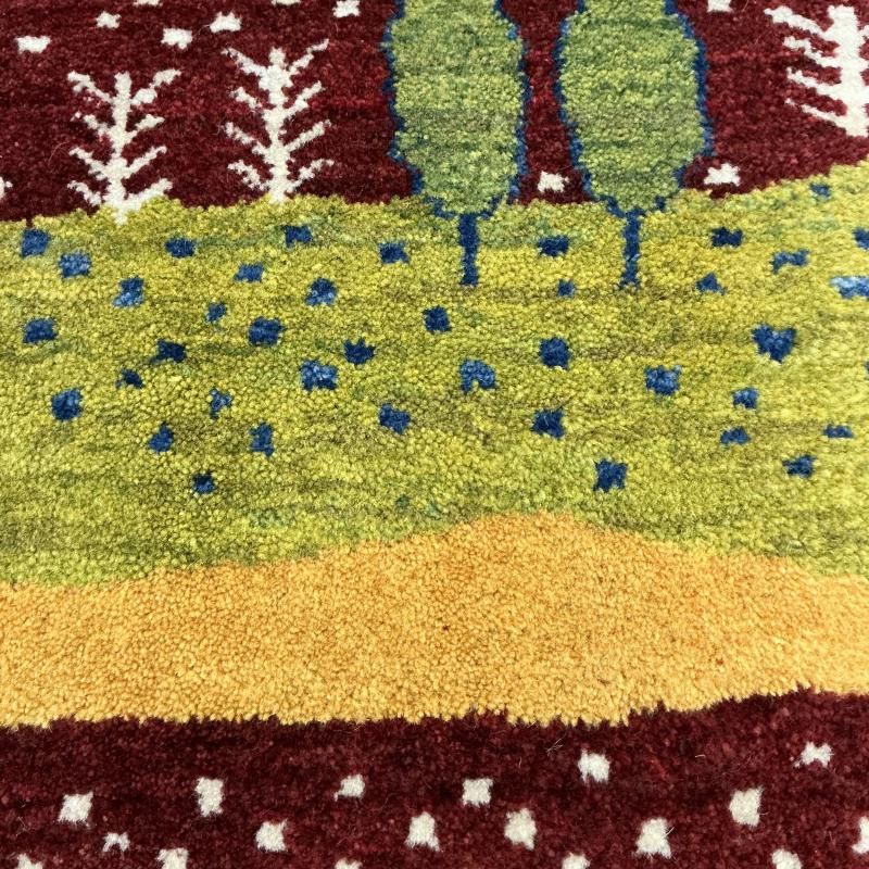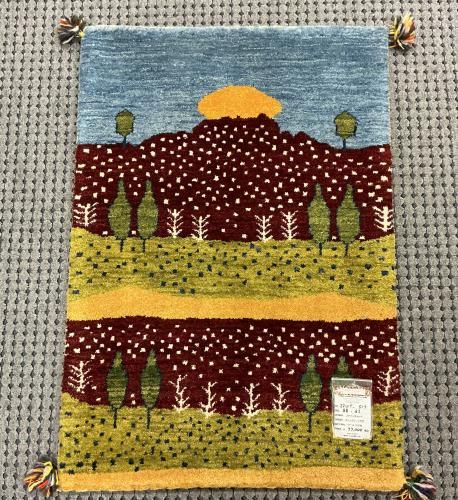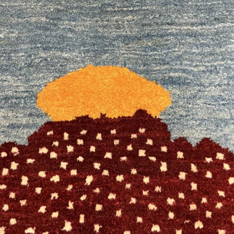 こちらは「家族が元気で長生きできますように」という願いの生命の木や山、太陽などたくさん織られた愛情たっぷりのギャッベです。